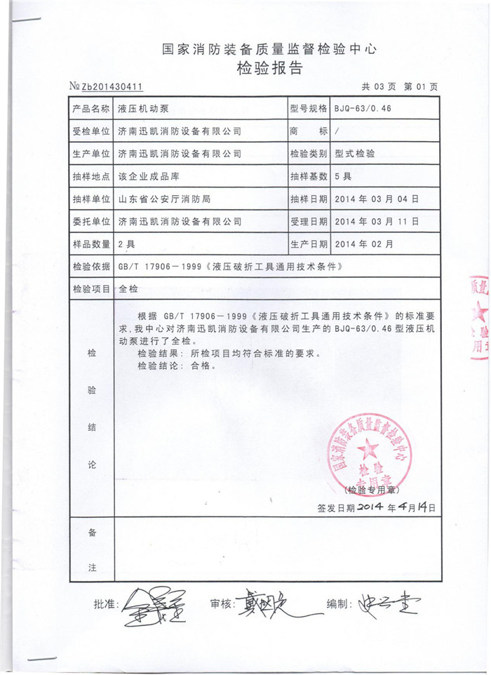 2014年1月,澳门新葡京官网牌液压破拆工具组中全部产品,由山东公安消防总队抽样封存,然后交由国家消防装备监督检验中心进行检测。澳门新葡京官网牌液压机动泵、液压手动泵、液压扩张器、液压剪切器、液压剪扩器和液压撑顶器等均通过了国标测试,并颁发了认证证书。